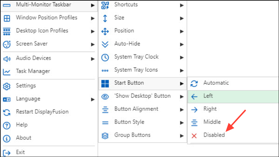 Step 4: To remove the Start button or further tailor the taskbar, right-click it and use the Multi-Monitor Taskbar > Start Button > Disabled option. Repeat on each monitor as needed.