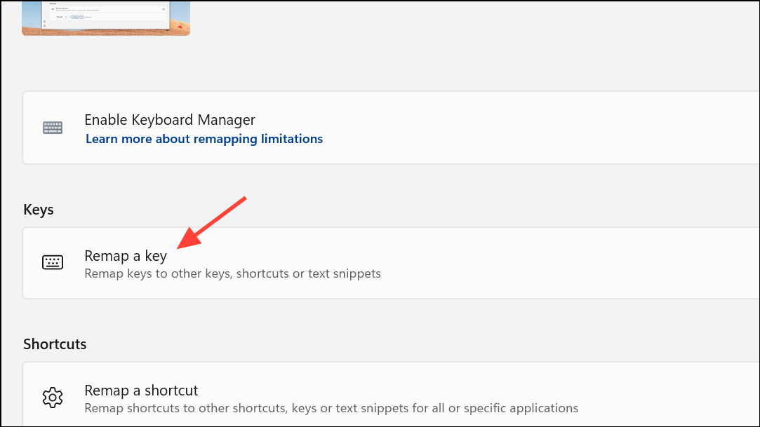 Step 2: Click Remap a key in the Keys section. In the remapping window, select the Add (+) button to create a new remapping entry.