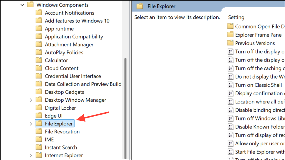 Step 2: In the Group Policy Editor, navigate to User Configuration > Administrative Templates > Windows Components > File Explorer.