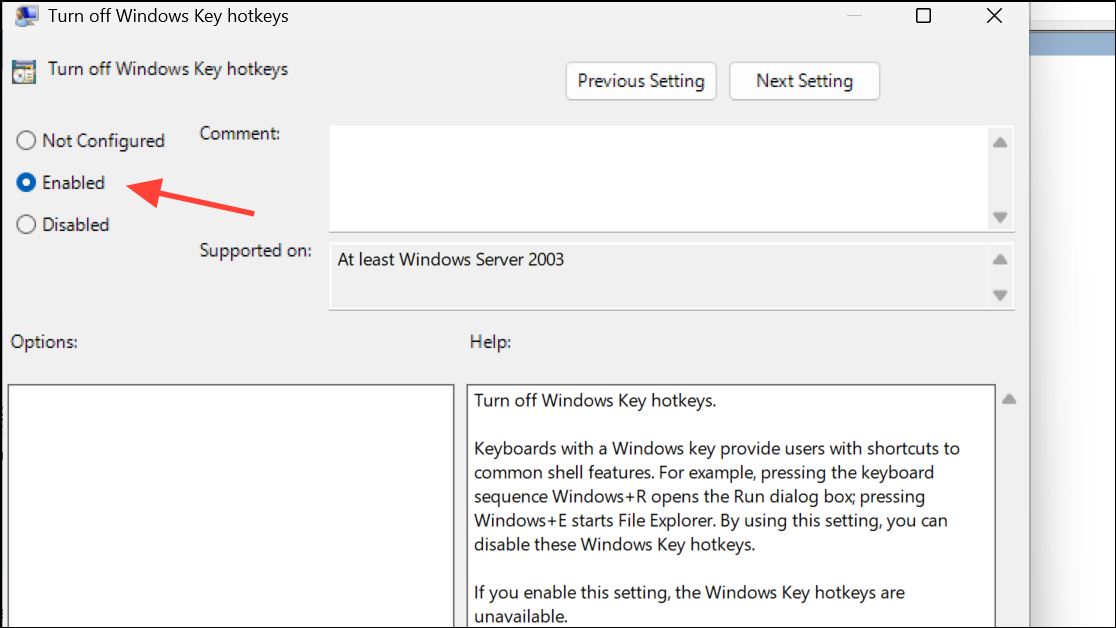 Step 3: Enable the policy labeled Turn off Windows key shortcuts.