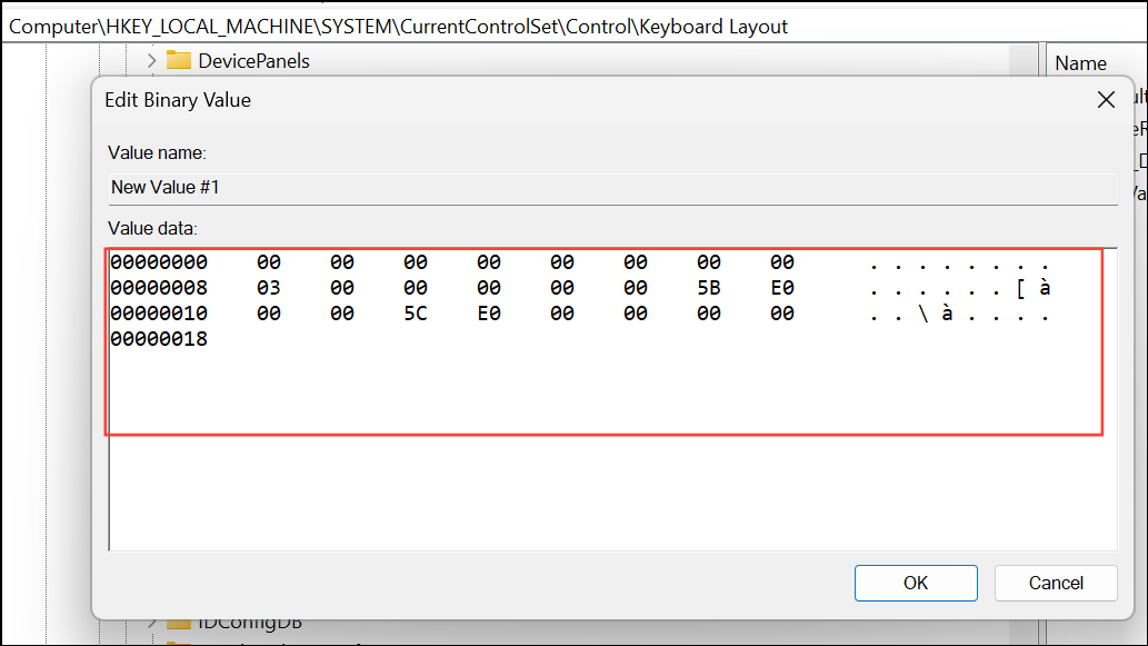 Step 4: Double-click Scancode Map and enter the following binary data:
