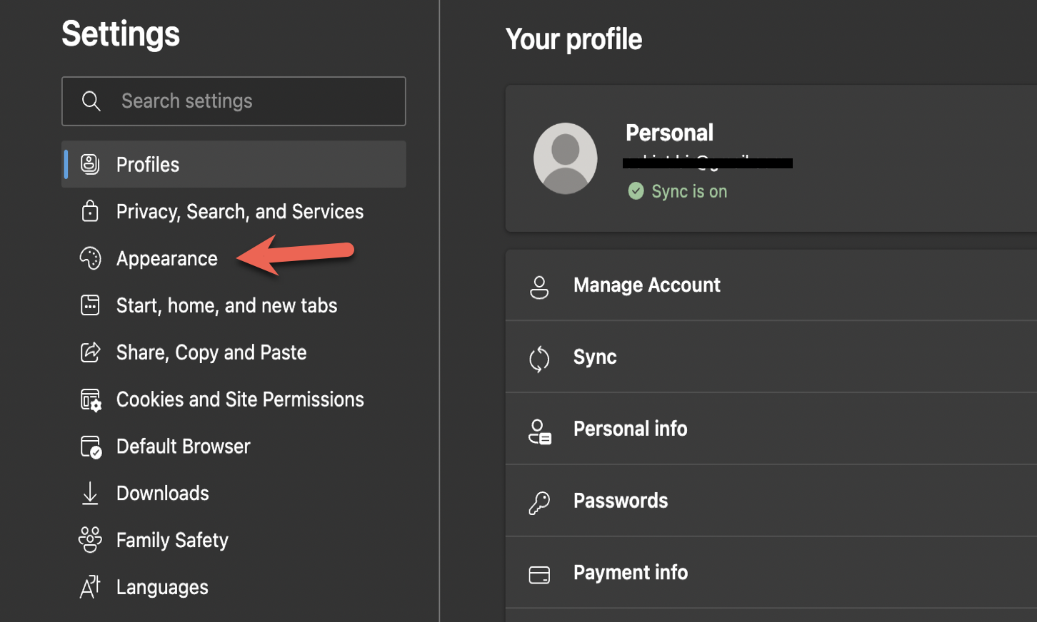 Now, from the navigation menu on the left section of the window, locate and click on the ‘Appearance’ option.