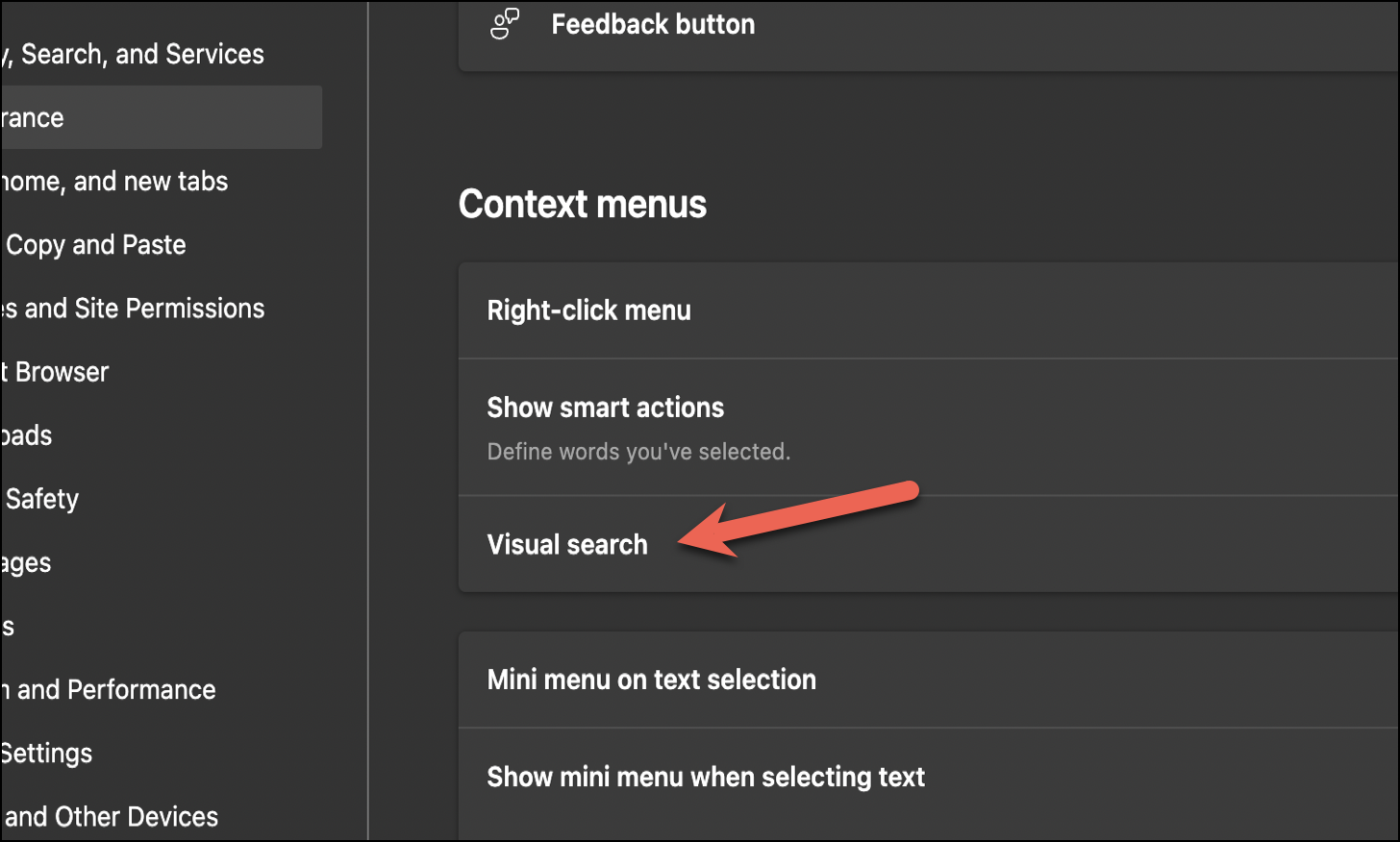 In the ‘Context menus’ subhead, click on the ‘Visual search’ option.