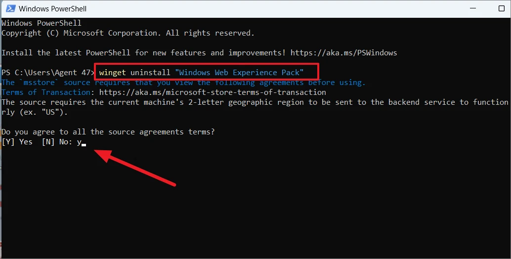 winget uninstall "Windows web experience Pack"Step 4: If the Winget tool asks you to accept the source terms, type Y and press Enter to proceed.