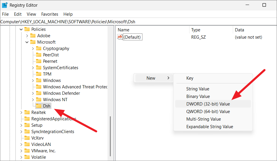 Step 6: With the Dsh key selected, right-click in the right pane, choose New, and select DWORD (32-bit) Value.