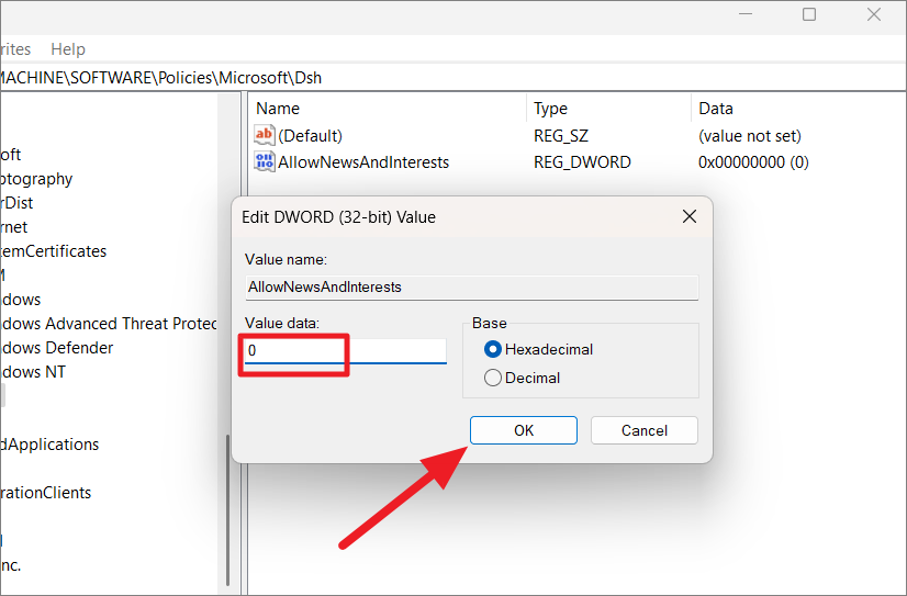 Step 7: Name this new DWORD value as AllowNewsAndInterests. Double-click on it, set the Value data to 0, and click OK.