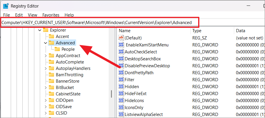 HKEY_CURRENT_USER\Software\Microsoft\Windows\CurrentVersion\Explorer\Advanced