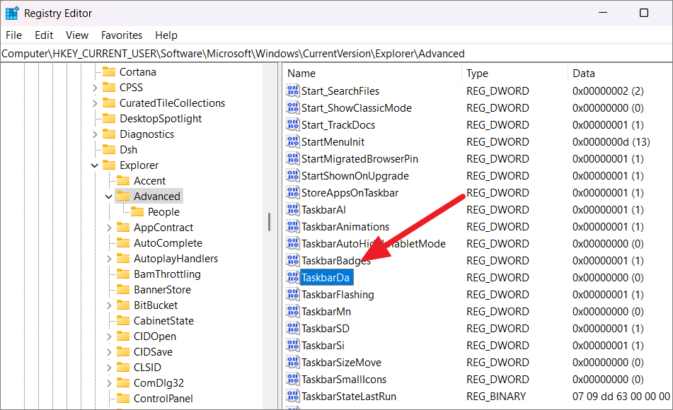 Step 4: Look for a DWORD value named TaskbarDa. If it doesn't exist, right-click in the right pane, select New, and choose DWORD (32-bit) Value. Name it TaskbarDa.