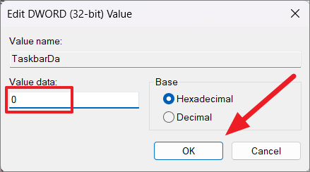 Step 5: Double-click on TaskbarDa, set the Value data to 0, and click OK.