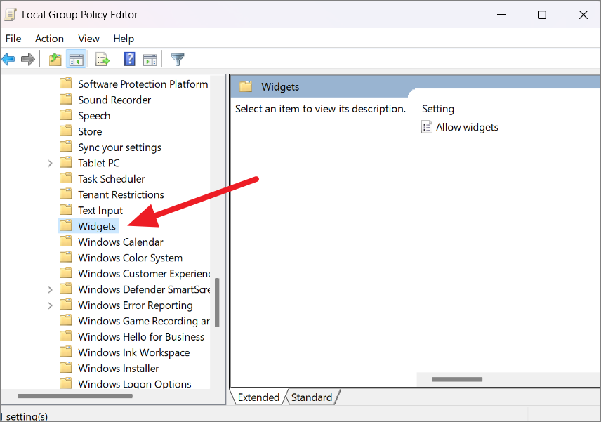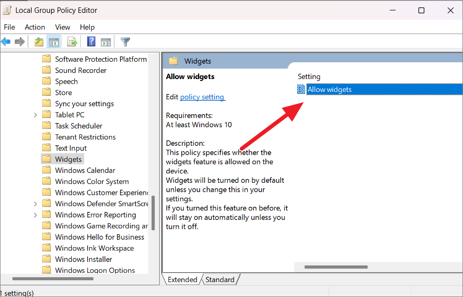 Step 3: On the right pane, double-click on the Allow widgets policy.