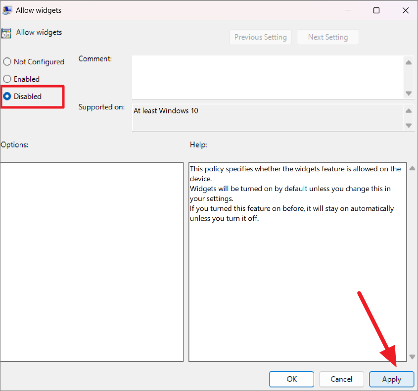 After restarting your computer, the Widgets feature will be disabled and removed from the taskbar. If you wish to re-enable Widgets later, return to the Allow widgets policy and set it to Not Configured or Enabled.
