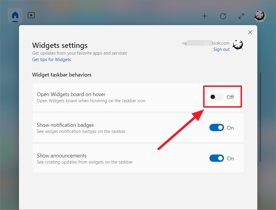 If you want to keep the Widgets icon on the taskbar but prevent the Widgets board from opening when you hover over it, follow these steps: