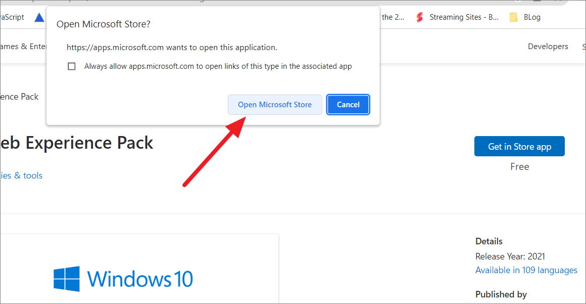 Step 3: A prompt will appear at the top of the page asking to open Microsoft Store. Click Open Microsoft Store.