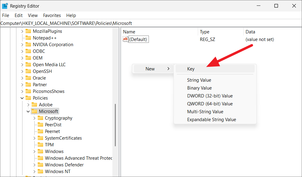 Step 4: Right-click on the Microsoft key in the left pane, select New, then click on Key.