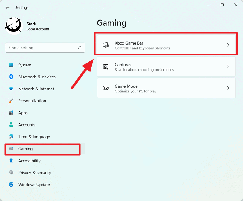Step 2: In Settings, select the 'Gaming' tab from the left sidebar, then click on 'Xbox Game Bar' on the right side.