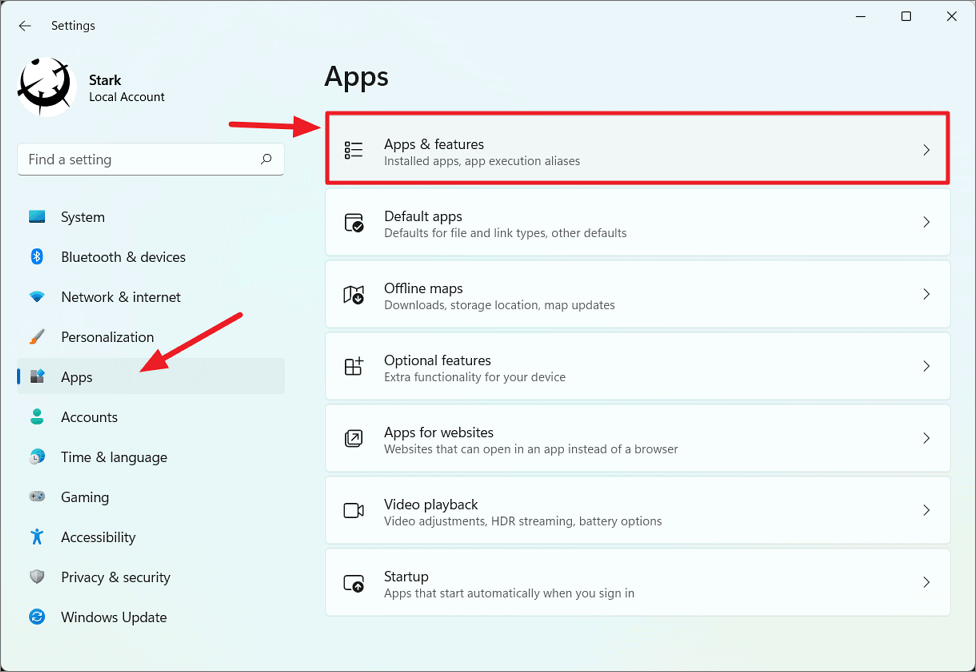 Step 4: To ensure the Game Bar doesn't run any background processes, return to the main Settings menu. Select 'Apps' from the left sidebar, then click on 'Apps & features'.