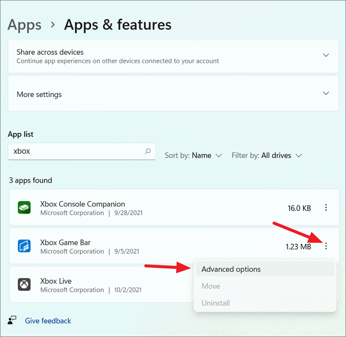 Step 6: Click the three vertical dots next to 'Xbox Game Bar' and select 'Advanced options' from the dropdown menu.