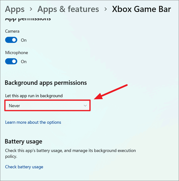 Step 7: In the advanced options, locate the 'Background app permissions' section. From the dropdown menu under it, select 'Never' to prevent the app from running in the background.