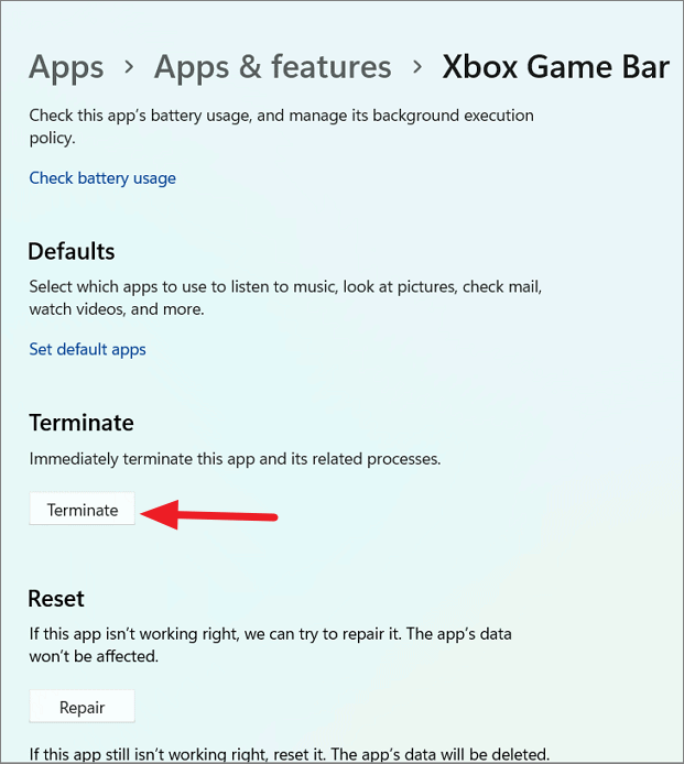 Step 8: Scroll down and click the 'Terminate' button to immediately stop the app and its related processes.