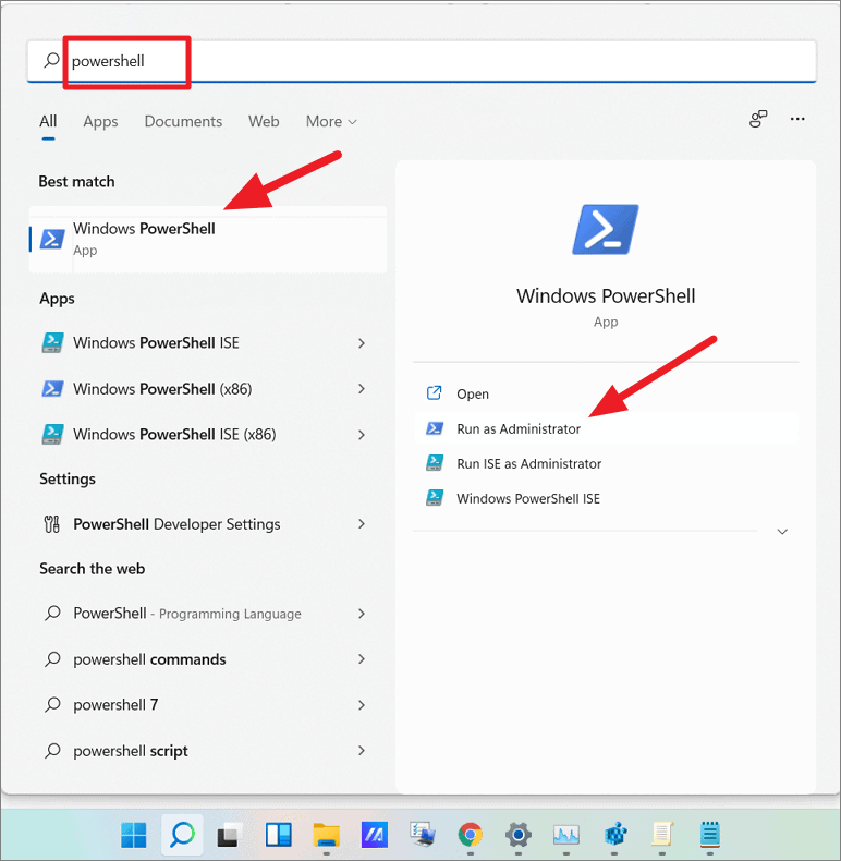 Step 1: Open Windows PowerShell with administrative privileges. To do this, search for PowerShell in the Windows Search bar, then click 'Run as administrator' on the right side for the top result.