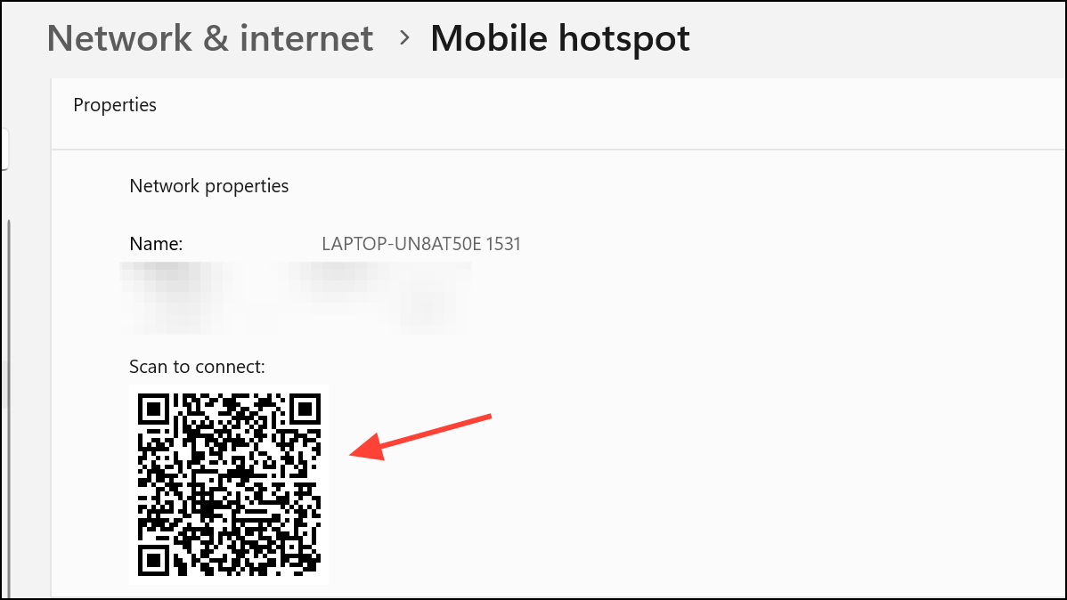 Step 3: Click the Mobile hotspot setting to access all related settings. Turn on the Mobile hotspot toggle and scroll down to see the QR code under Properties.