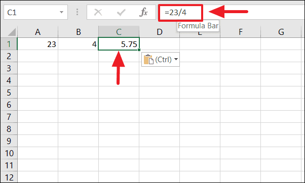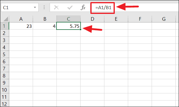=dividend/divisorFor instance, if you want to divide 23 by 4, you would input the following formula: