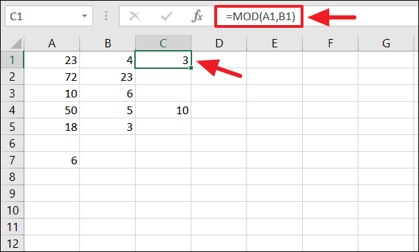 =MOD(23, 4)This formula returns 3, which is the remainder when 23 is divided by 4.