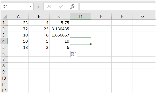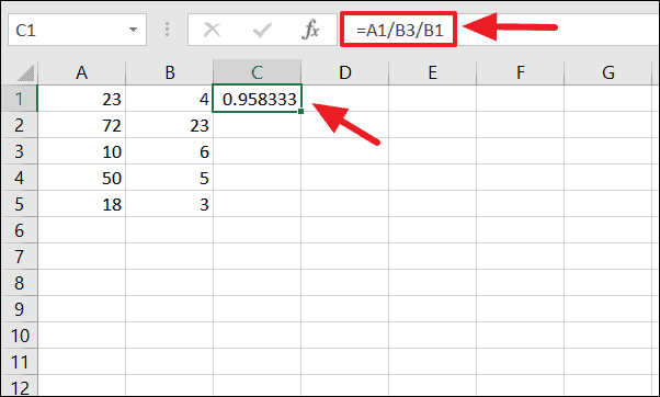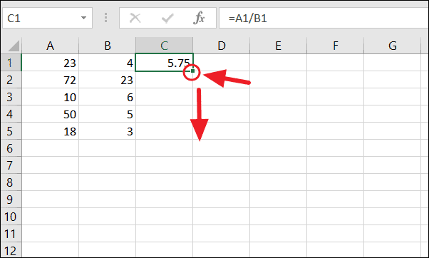 =A1/B1After calculating the first result, you can quickly apply the same formula to the rest of the rows. Click on the cell with the formula (C1), and hover over the small green square at the bottom-right corner of the cell (known as the fill handle). Click and drag the fill handle down to cover all the rows you wish to calculate (e.g., down to cell C5).