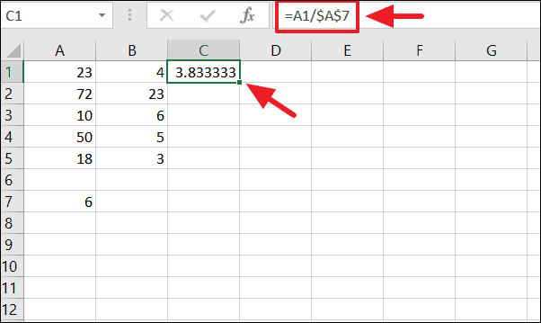 =A1/$A$7The $A$7 reference ensures that when you copy the formula down, the divisor remains the constant value in cell A7.