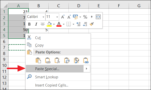 Step 2: Select the range of cells you want to divide (e.g., A1:A5). Right-click within the selected range and choose Paste Special.