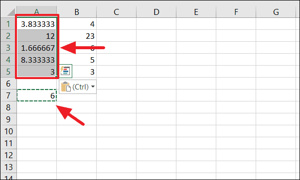 This action will divide each cell in the selected range by the constant number in cell A7. Note that this method replaces the original values in A1:A5 with the division results, so you may want to copy the original data to another location if you need to preserve it.