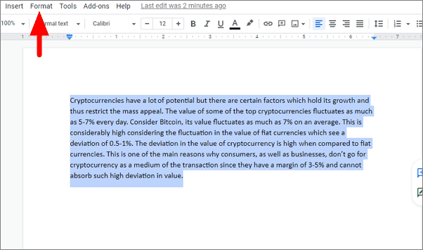 Step 2: Click on the Format menu located at the top of the Google Docs window.