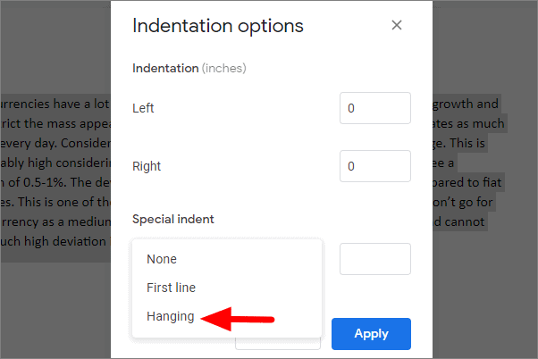 Step 4: In the Indentation options dialog box, find the Special indent section. Click the drop-down menu labeled None and choose Hanging.