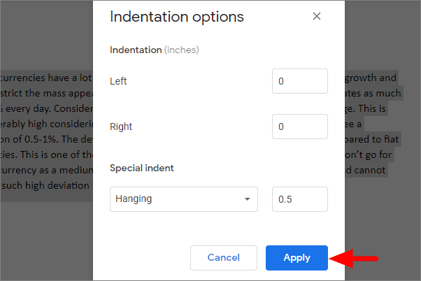Step 6: Click on Apply to implement the hanging indent to your selected text.