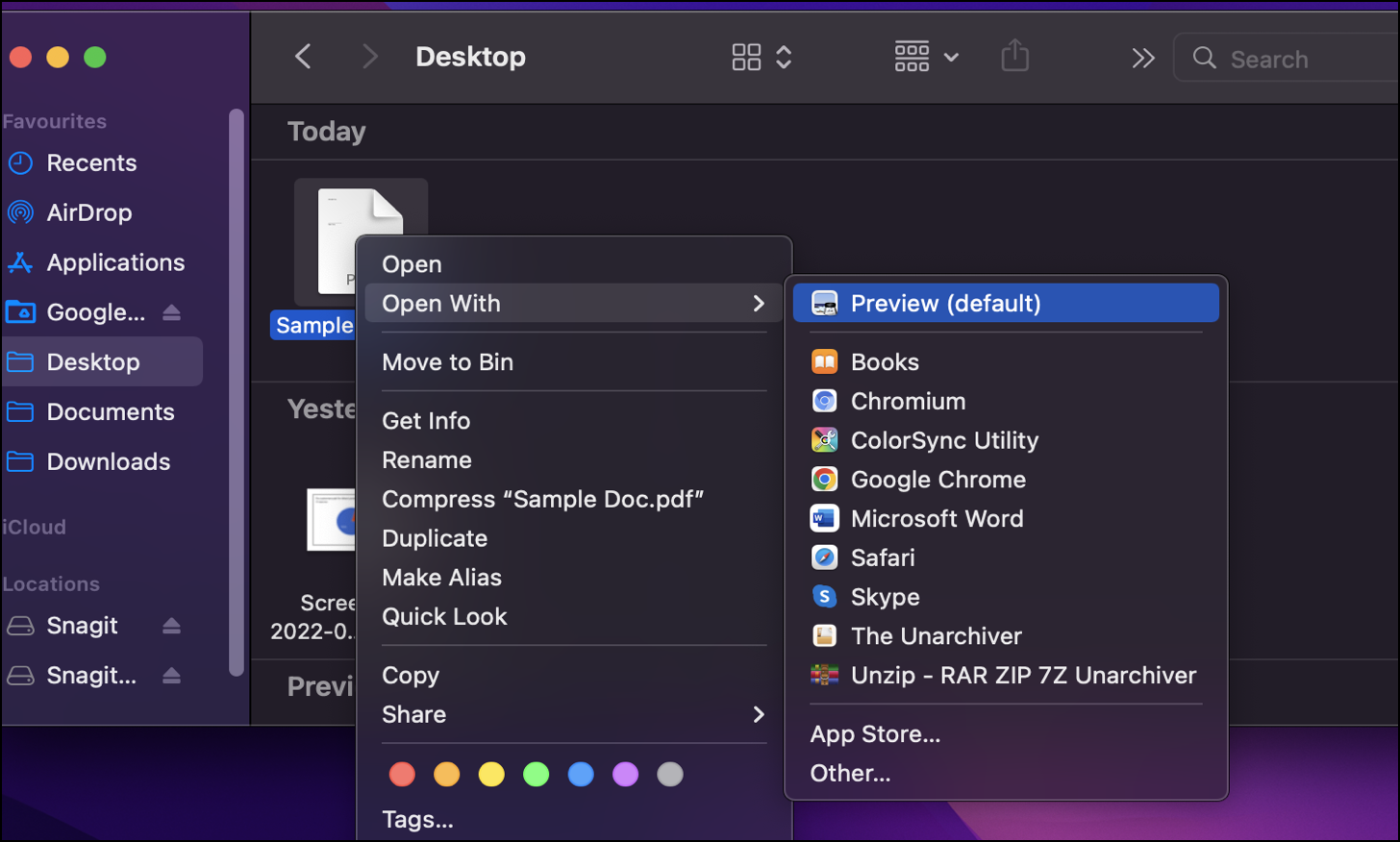 Next, right-click on the file and hover over the ‘Open with’ option, and choose the ‘Preview’ option from the sub-menu.
