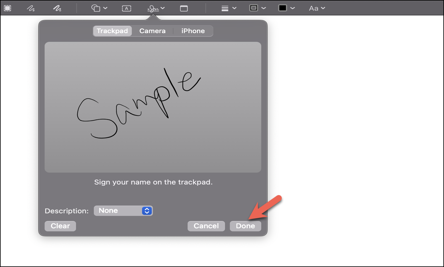 You can now use your trackpad to create your own digital signature. Once done, click on any key on your keyboard.