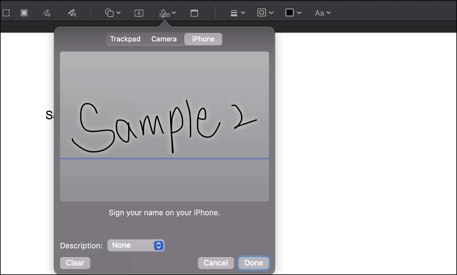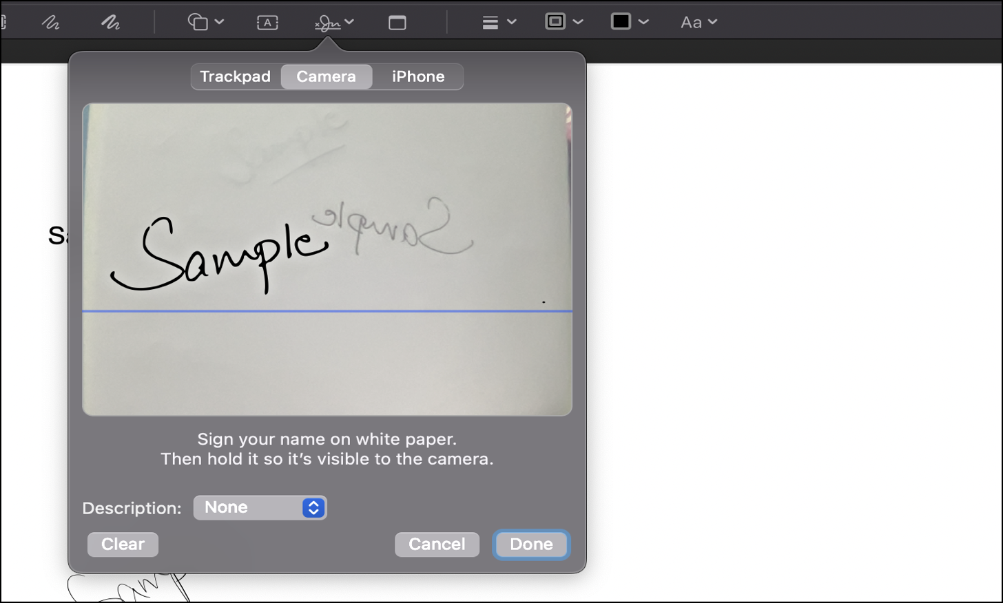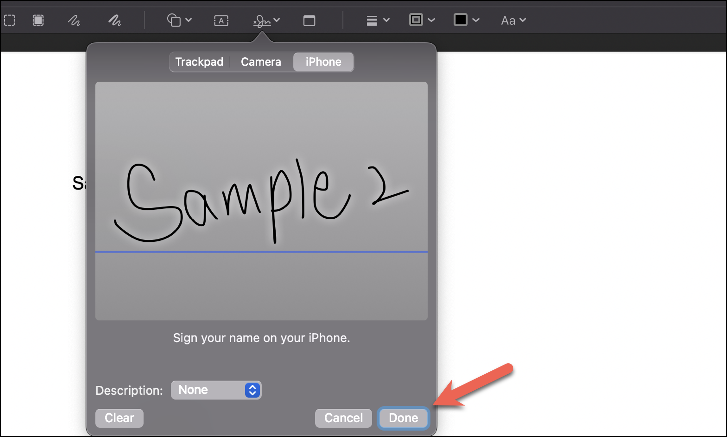 Finally, click on ‘Done’ to save it. If you’re not happy with how it turned out, click on ‘Clear’ and sign again.