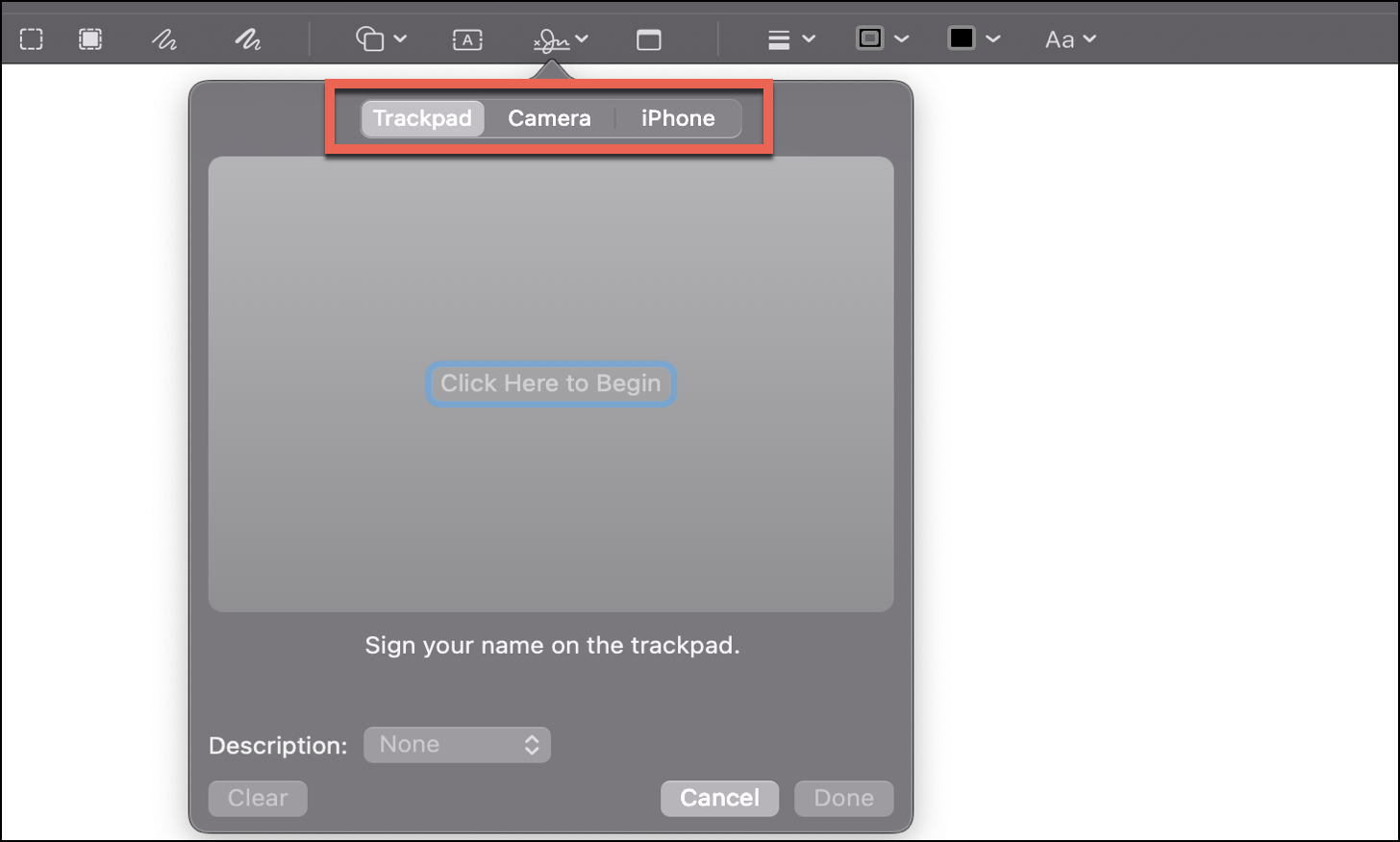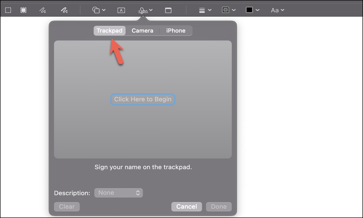 A pop-up window will appear on clicking on the ‘Create Signature’ icon that would allow you to create a digital signature using either your ‘Trackpad’, ‘Camera’, or ‘iPhone’.