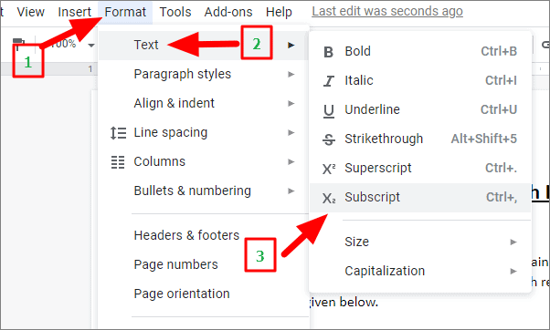 Step 3: In the dropdown menu, hover over Text, then select Subscript from the extended menu. This will convert the selected text into subscript format.