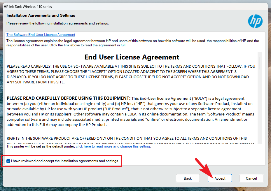 - Review the installation agreements and settings, select the checkbox to accept them, and then click “Accept”.