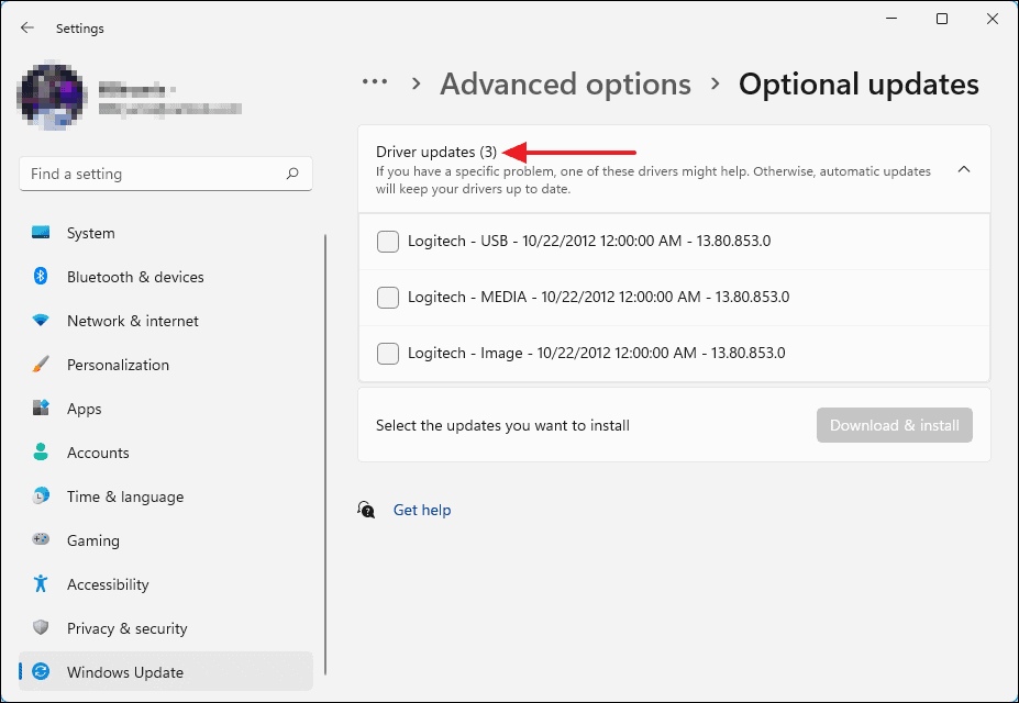 - You'll see a list of available optional updates. Expand the Driver updates section to view the specific drivers.