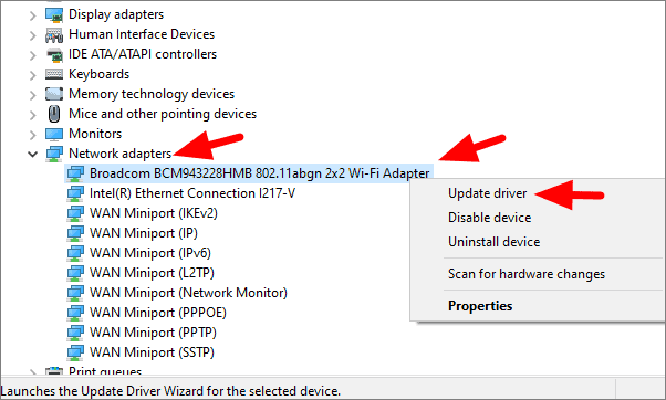 In Device Manager, click on the arrow adjoining the ‘Network adapters’ to expand it. From the list of drivers, select the one for which you have downloaded the updated version. Right-click on the driver, and then select ‘Update driver’ from the context menu.