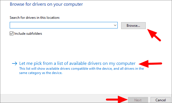 Click on ‘Browse’ to search and select the driver file you just downloaded to your system. After you have selected the file, click on ‘Next’, and the driver will be installed. You can also select ‘Let me pick from a list of available drivers on my computer’ to see a list of drivers, then select and install the required one.