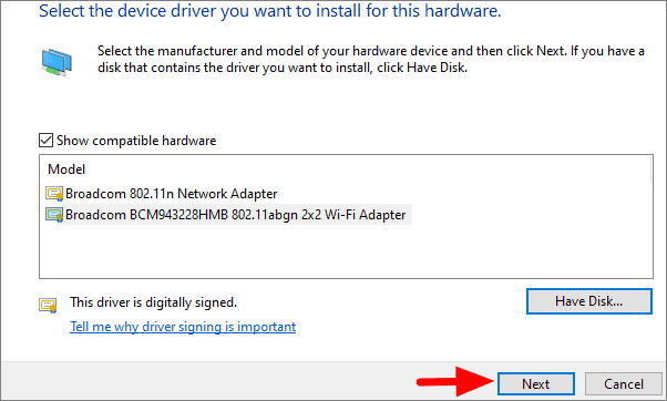After your click on the select driver option, you will be displayed a list of relevant drivers. Select the one you just downloaded and click on ‘Next’ at the bottom. The selected driver will be installed.