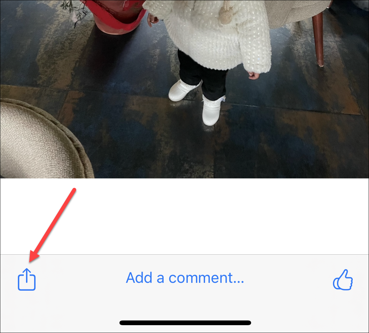 Find the photo that you want to save and tap it to open it. Then, tap the ‘Share’ icon in the bottom-left corner of the screen.