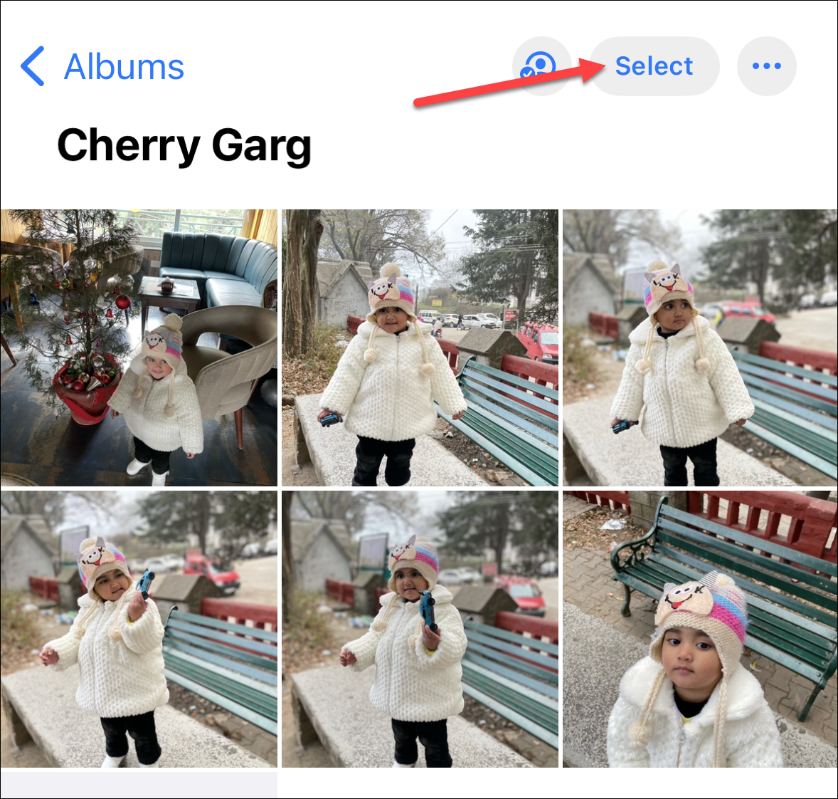 To save multiple photos at once, return to the album so that the grid of photos is visible. Then, tap the ‘Select’ option in the top-right corner.