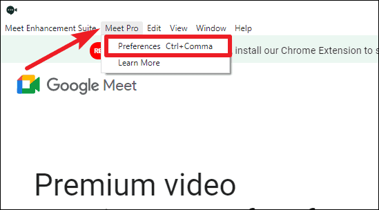 Go to the menu bar and click the ‘Meet Pro’ menu option. Then, select ‘Preferences’ from the menu.
