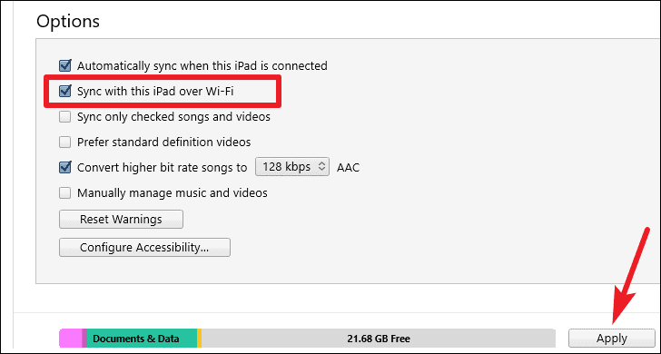- Check the box next to Sync with this [device] over Wi-Fi.