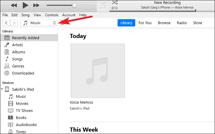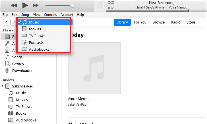 - To switch between different types of media, click the dropdown menu at the top left that says Music.