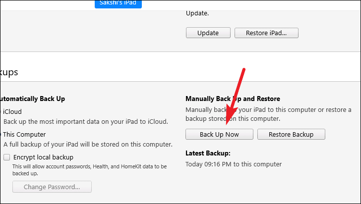 - Click Back Up Now to start the backup process.